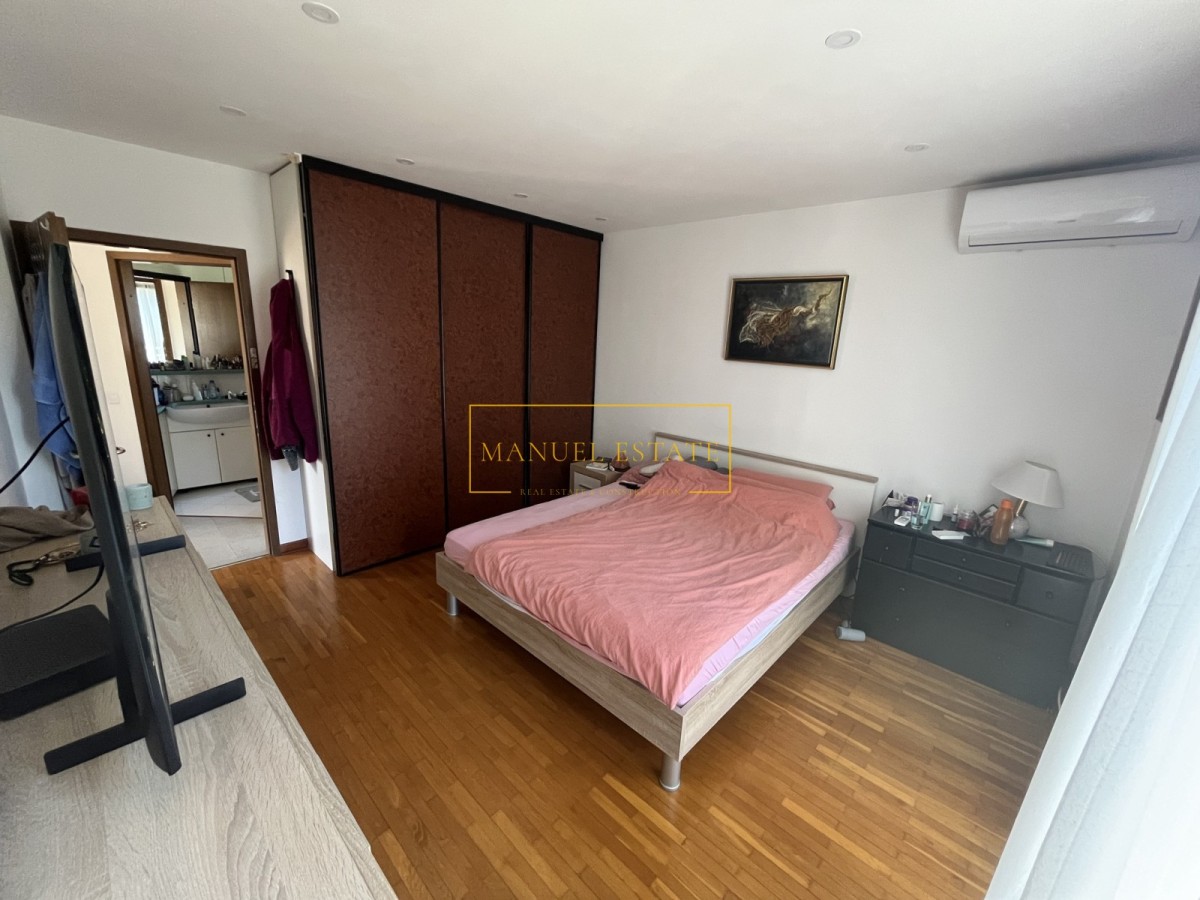 På första våningen finns en rymlig lägenhet på 115 m², som består av tre sovrum, ett modernt badrum, ett separat WC och ett stort vardagsrum med utgång till en stor terrass. Terrassen erbjuder en fantastisk panoramautsikt över havet och staden, perfekt för att njuta av solnedgångarna.