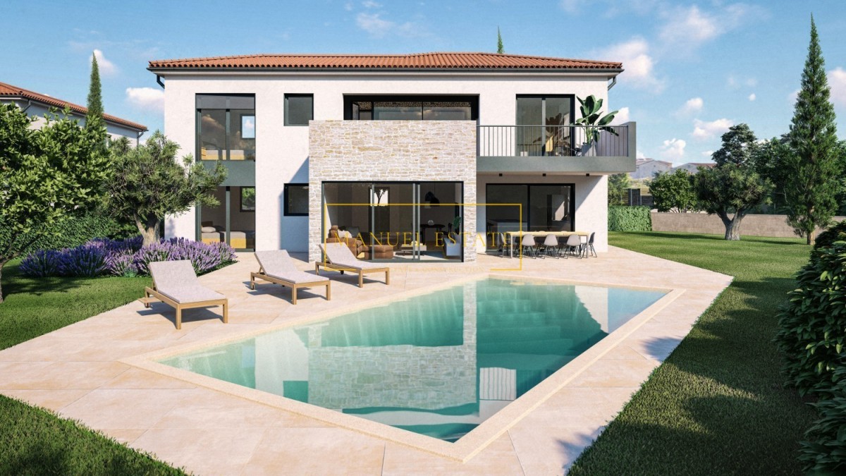 Fristående villa i närheten av Poreč, belägen i ett lugnt läge, ca 12 km från havet. Modern villa på 168,40 m2, på en tomt på 751 m2. Det är fördelat på två våningar, på bottenvåningen finns: ett rymligt vardagsrum, ett kök och en matsal med glasväggar och tillgång till terrassen, ett sovrum, ett badrum och ett förråd. På första våningen finns två sovrum, två badrum, en bastu med hall och en terrass med utsikt över poolen. Värme och kyla tillhandahålls av golvvärme på värmepump och fläktkonvektorer + luftkonditionering. Villan har även videoövervakning och larm. Noggrant anlagd trädgård med pool (möjlighet att installera värmepump Två parkeringsplatser). Planerat färdigställande av bygget är sommaren 2024. Det annonserade priset på fastigheten plus moms. Priset avser nyckelfärdigt hus med anlagd trädgård.
