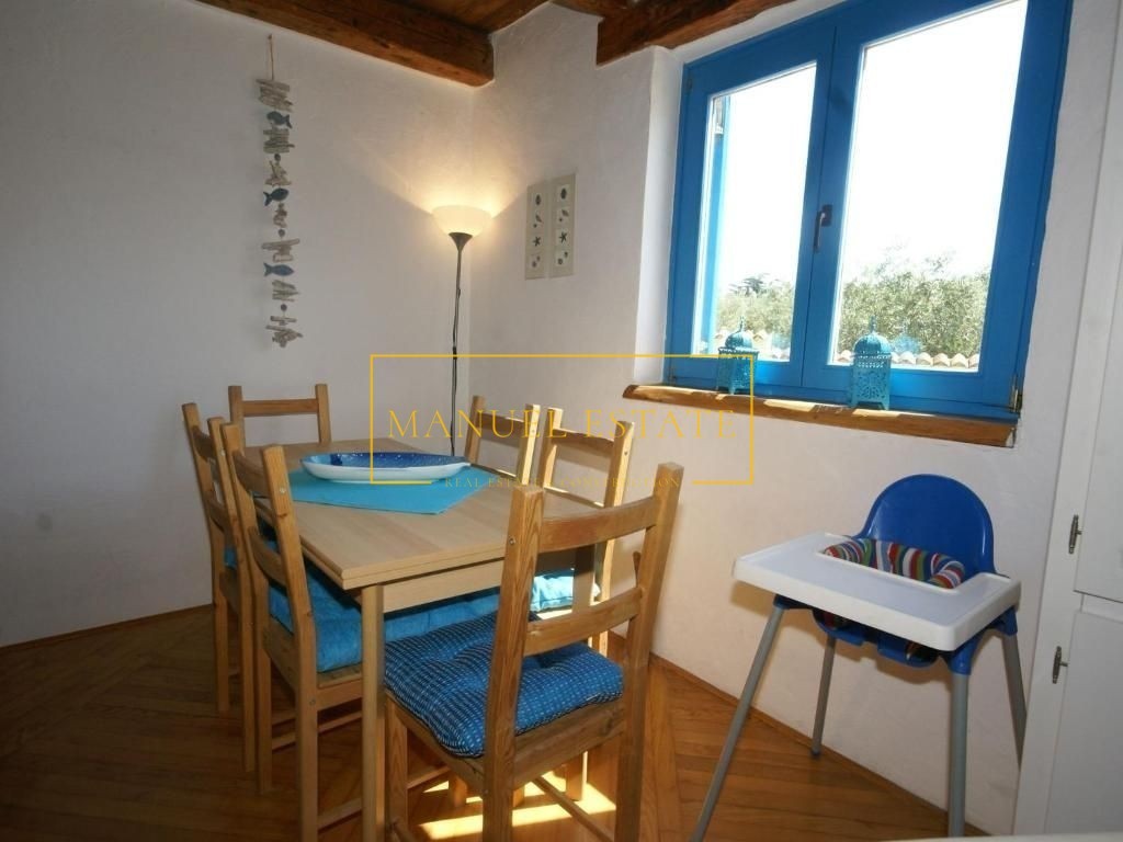Hus i Kaštelir, yta 140 m2, på en tomt på 383 m2. Det är fördelat på två våningar, bottenvåningen och första våningen; den har en hall, ett skafferi, ett kök med matsal, ett vardagsrum med öppen spis, tre sovrum, ett badrum, två toaletter och två terrasser. Uppvärmning/kyla: vedeldad spis, luftkonditionering. Pool med solplats. Noggrant anlagd trädgård. Inhägnad gård med parkering. Delvis havsutsikt. Avståndet från havet och de första stränderna är ca 9 km. Poreč ligger 14 km bort.